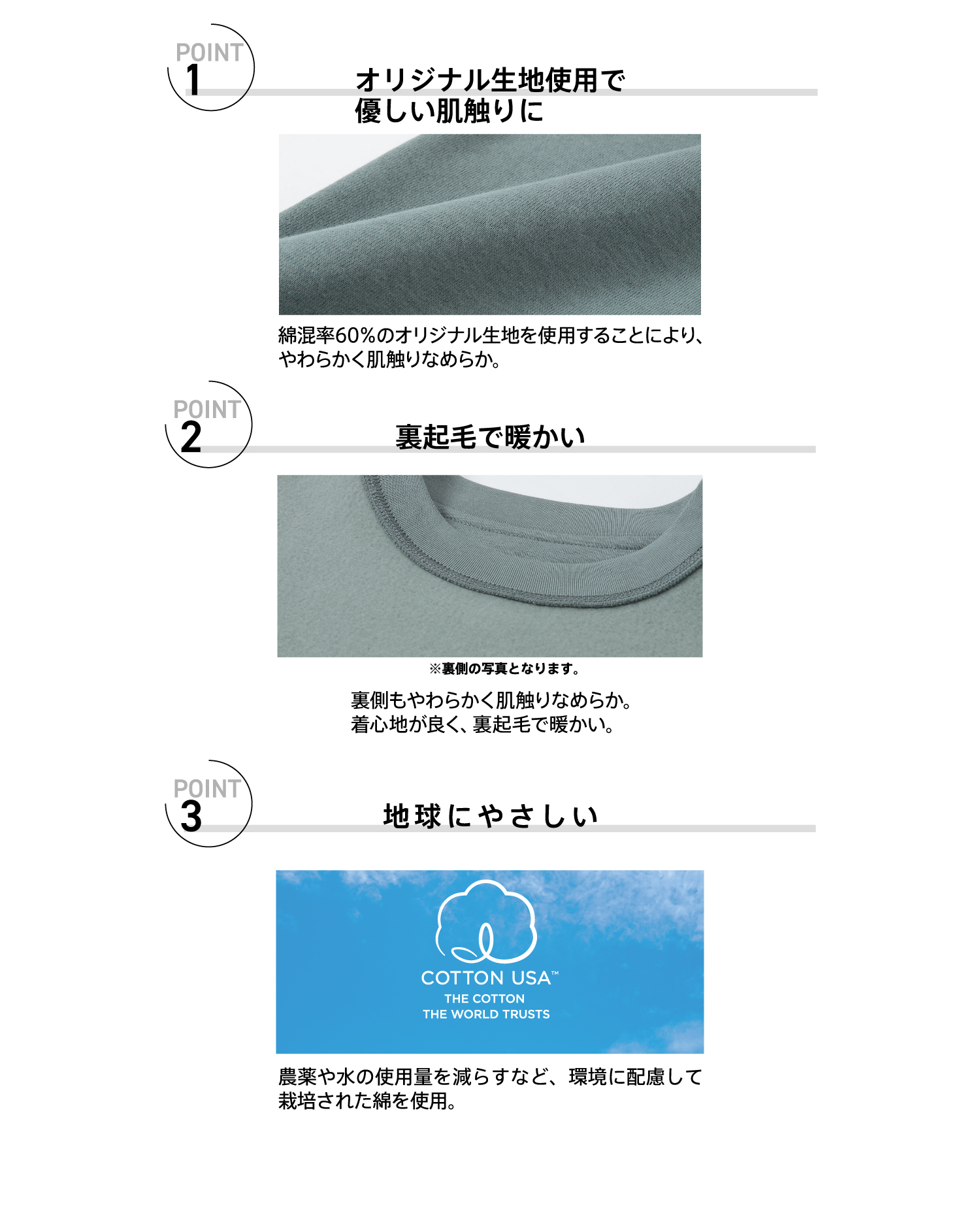 柔らかい風合い、肌触りのよい起毛感、毛玉になりにくい表面加工が特徴です。