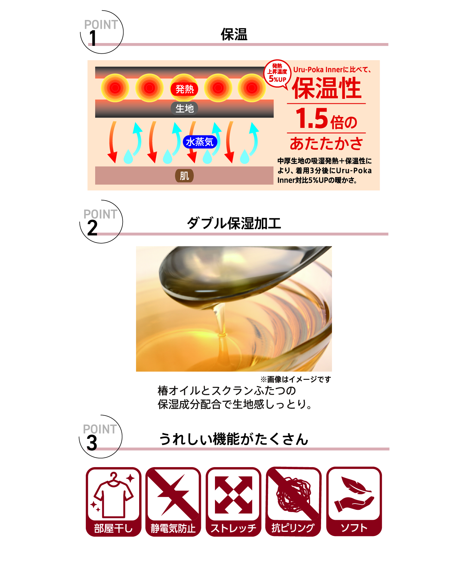 Tweet シェア メンズ Uru-Poka(ウルポカ)インナー プラス 椿オイルとスクワランふたつの保湿成分を配合し、しっとりした生地感に仕上げました。Uru-Pokaインナーレギュラータイプより生地のボリュームをアップし、発熱上昇温度5%アップ、保温性1.5倍の暖かさを実現しました。 販売期間:9月〜1月下旬