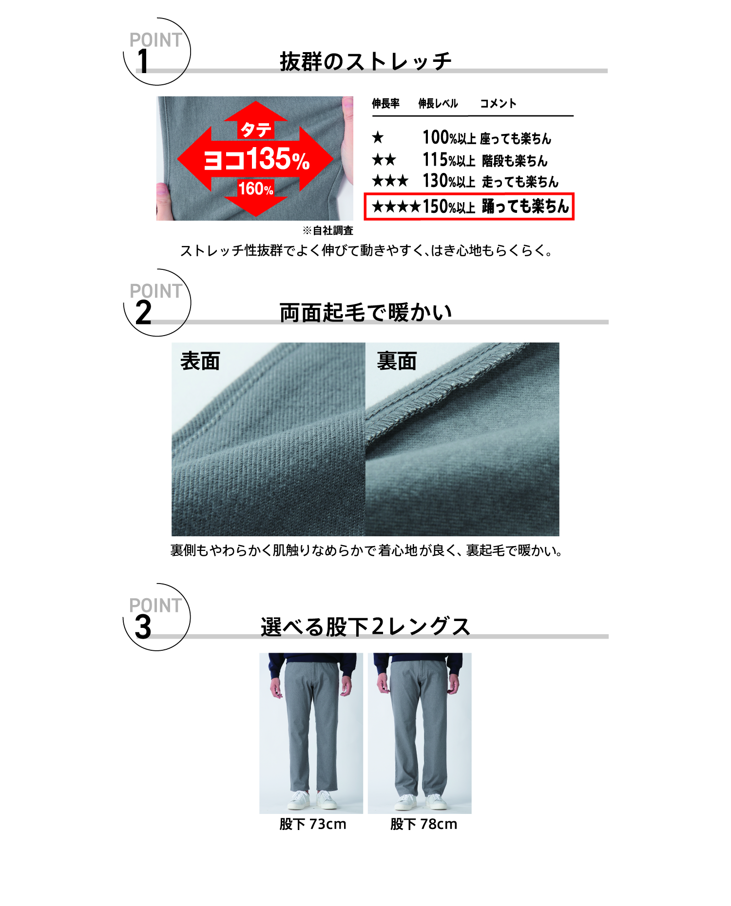 光吸収発熱フリース裏地でしっかりあたたか。ヨコ120%のストレッチとソフトな着心地で、毎日履きたくなるパンツに仕上げました。