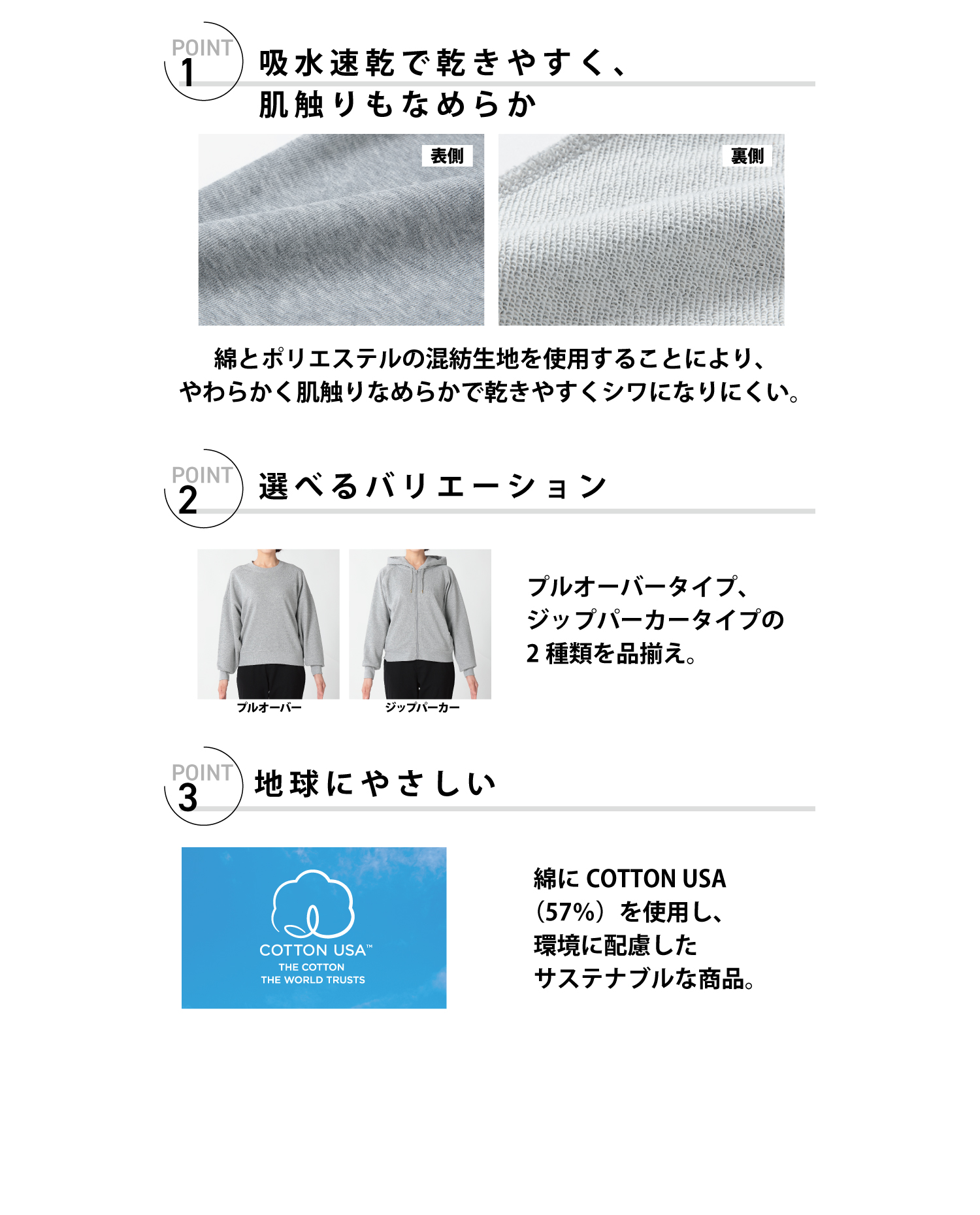Tweet シェア 綿-DECO トレーナー 吸水速乾で乾きやすく肌触りなめらかな綿・ポリエステル混紡生地を使用し、シワになりにくい。 COTTON USA(57%)配合で地球に優しいサステナブル商品です。