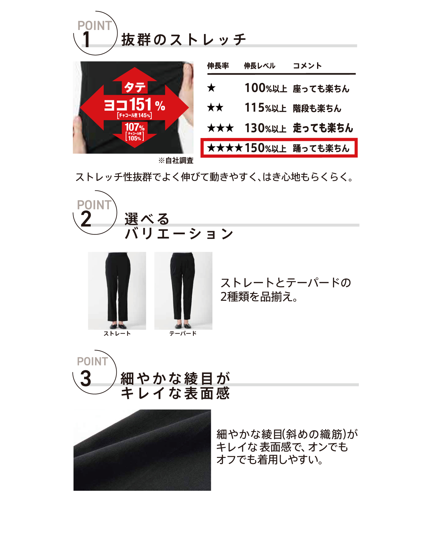 抜群のストレッチでよく伸び動きやすく、はき心地らくらく。